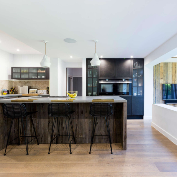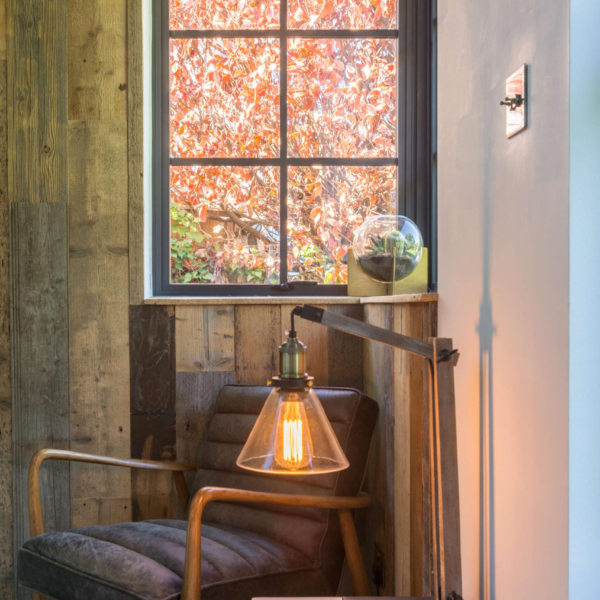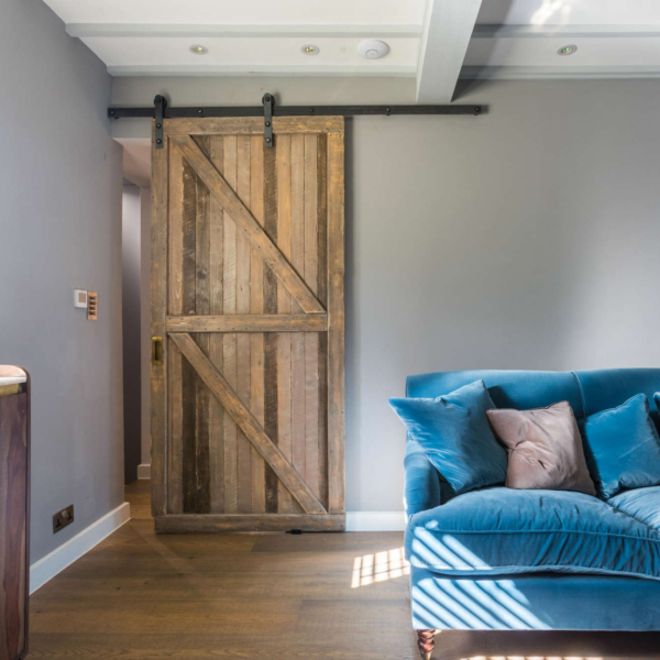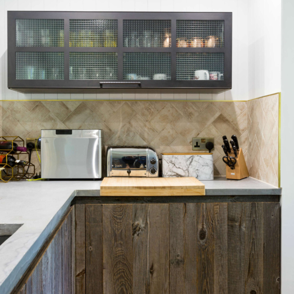 • Bespoke wood panelling and distressed pine cladding