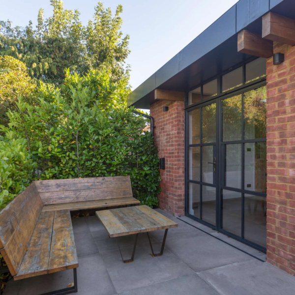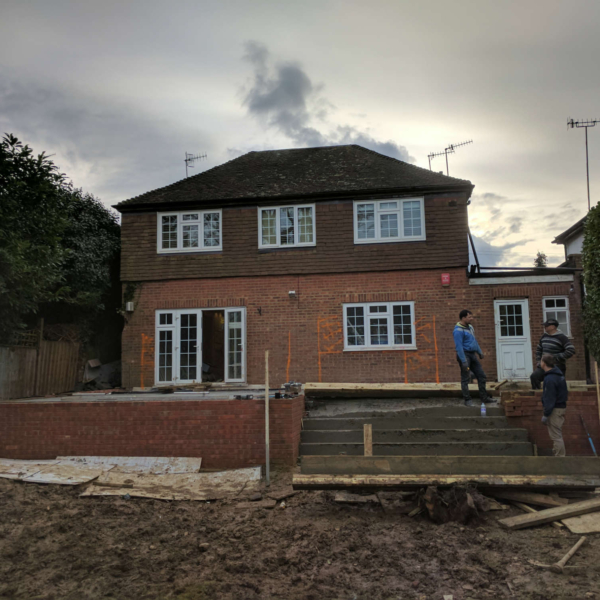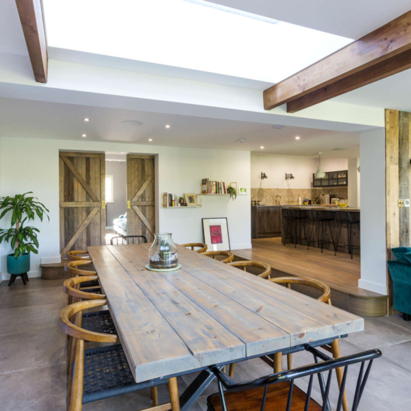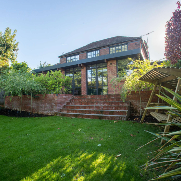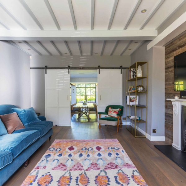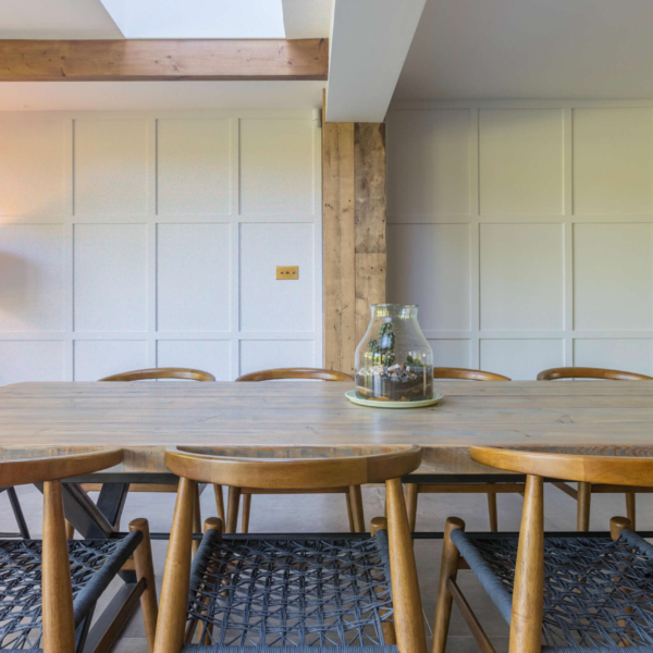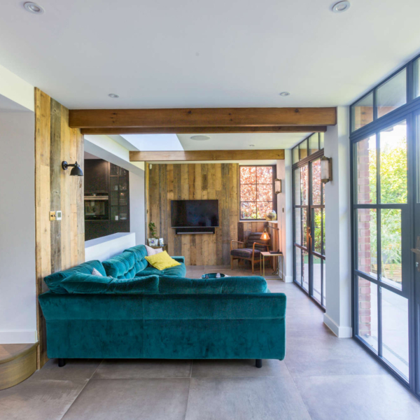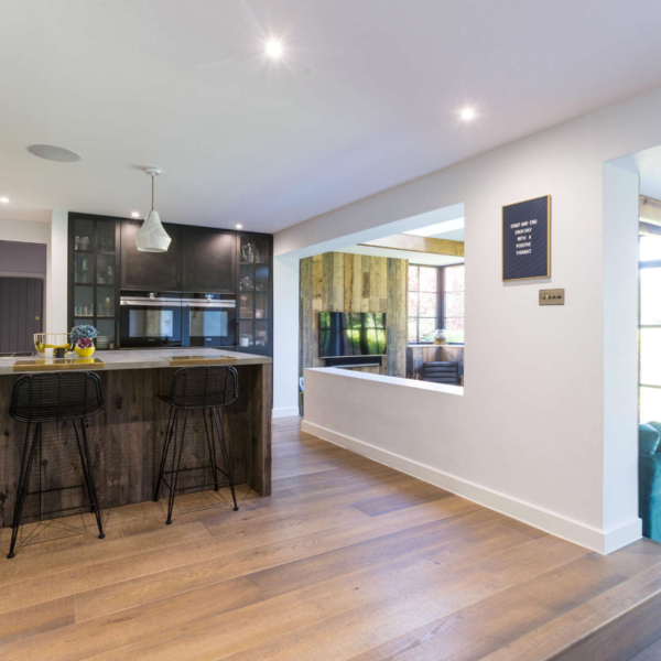 Rear extension and internal ground floor alterations to a detached period property in Bushey, enlarging the Kitchen and Dining Room into a new open plan family space with additional snug. There is enhanced external access through new aluminium heritage French doors to a new terrace and steps to the garden. The use of exposed timber ceiling beams as well as heritage doors tied a modern addition to the fabric of the period house